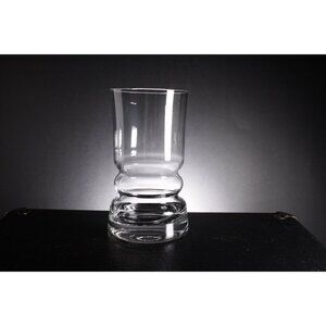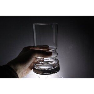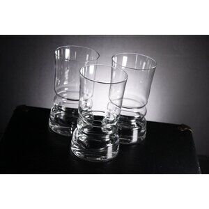 A set of 3 heavy glass bottom drinking glasses, possibly ships drinking glasses, as it will be near impossible to knock these over. With a ridge waisted design, and thick glass foot, the sides are a regular thickness with a subtle curve to the top half. These are unmarked for a maker, but look most like the designs of Magnor Glassverk (Norway) from the 1970s. They are in great vintage condition with only small marks of age and use, no chips or cracks.