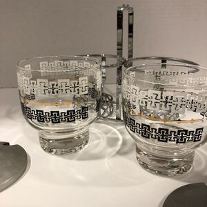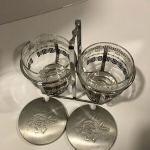 Mid-Century Libbey Glass and Silver Condiment 2 Jar Vintage Set with lids and Caddy. Two small glasses with black and white geometric pattern and two solver kids, with cutouts for spoons. Spoons not included. The lids have a rose design. No chips to the glasses