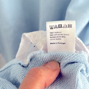 DESCRIPTION: Such a cute scoop neck mix media top in powder blue sweatshirt like front and an islet embroidered contrasting white back. Flowy & oversized