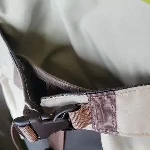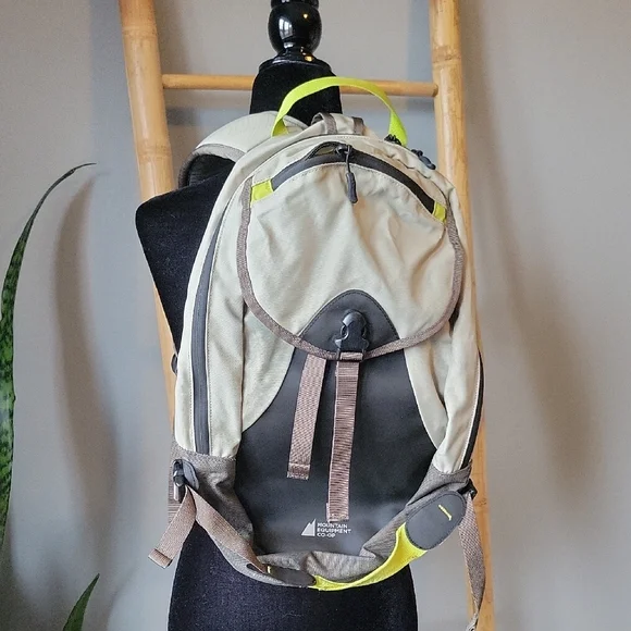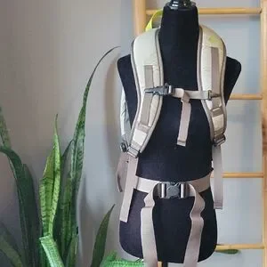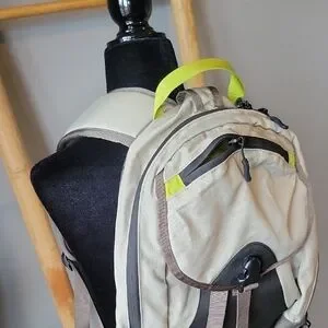 Versatile backpack in beige and black with subtle neon yellow accents. Durable construction with multiple compartments for organized storage. Padded straps and back panel for comfortable carrying. Neutral beige tone pairs well with casual and outdoor wardrobes.