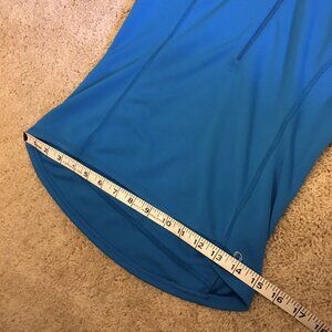 Good preowned condition bright blue, short-sleeve, scuba-style, mock neck sports top with a 3/4 zip up collar by MEC for women. There's an interesting fabric 3-compartment pouch in the back for water or storage. A cool unique piece. There are a few tiny little marks, but otherwise in good shape.