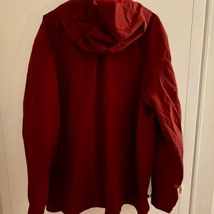 Bold deep red / burgundy rain shell jacket by MEC. Ideal for outdoor adventures and all the elements. Bonded zipped pockets. Size XXL.