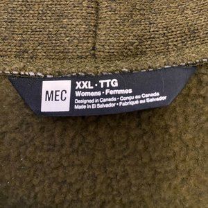 MEC drop shoulder fleece open cardigan. Great for indoors or outdoors for those milder days when you still need some added warmth. Soft olive green colour.