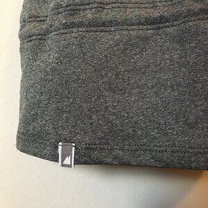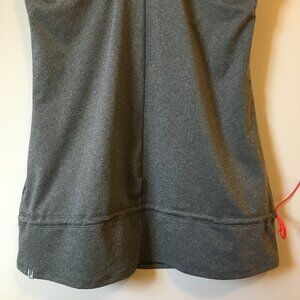 Very good preowned condition, racerback tank top by MEC in solid grey with neon orange accents and built in bra. Drawstring at the hips allow of adjustment.