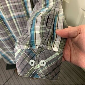 In very good condition. Neutral Plaid button down Relax fit cut With a cowboy western vibe. Made with organic cotton great breathable top. Collared, chest pocket, long sleeve 2 button wrist. Color is grayish taupe, blue and white. Tiny discoloration and on the inner collar. Nothing major. Please see pictures