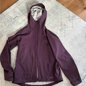 Stylish purple hooded jacket with zip closure and pockets.
