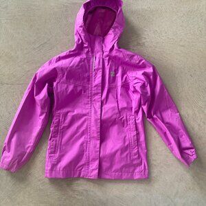 MEC Kids Pink Rain Jacket, good condition, Shell: %100 polyesther with polyurethan coating, Lining: 100% polyester exclusive of trim. Waterproof- breathable, reflective details. Elasticized cuffs and hoodie seal out the cold and damp.