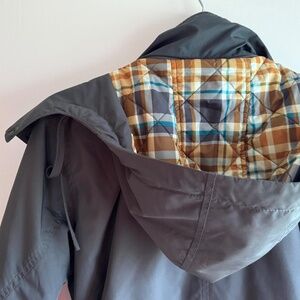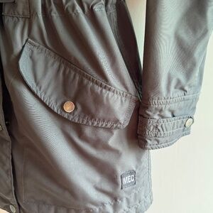 Features: removable hood, brass tone hardware, large zippers, adjustable waist, two front snap closure pockets.