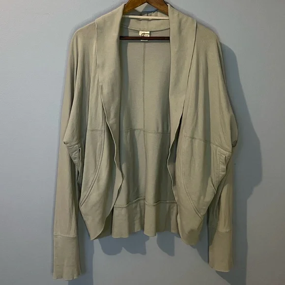 MEC organic cotton open cardigan with slit pockets. Light weight and machine washable. Small hole on left shoulder shown in last picture.