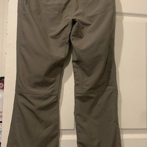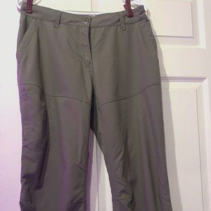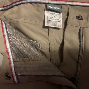 These lightweight pants are great for travel, hiking or just casual wear. Olive color with 2 zippered back pockets, one zippered leg pocket and 2 open side pockets. Elastic drawstring at cuffs to keep your pants out of the mud. Zip and snap front with internal drawstring. Excellent used condition, no visible signs of wear.