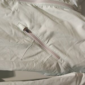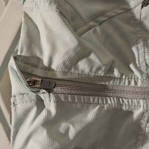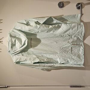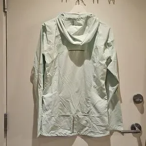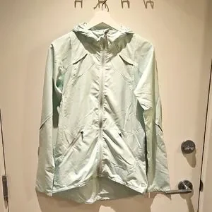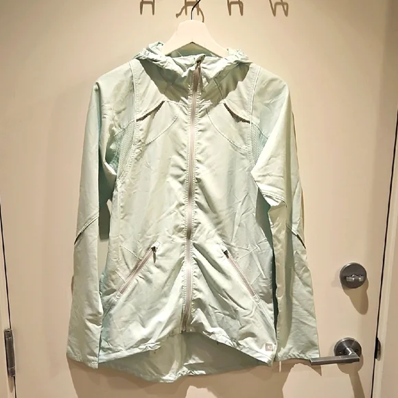 MEC slim-fit shell jacket. Snug fitting hood, zip pockets, mesh inserts. Reflective detailing on back, arms, and chest. Light mint green. Great condition! Size medium.