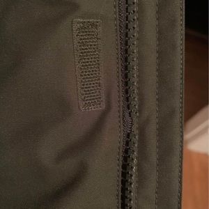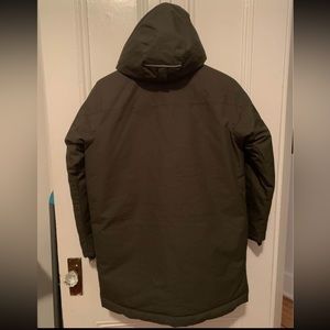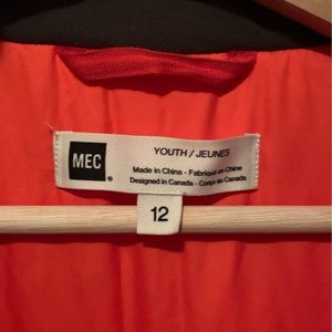 MEC Toaster jacket in great condition. Olive green exterior with orange interior. Size Youth 12 (fits a Women’s Small). Double front pockets. Small flaw in zipper but it remains perfectly functional.