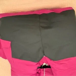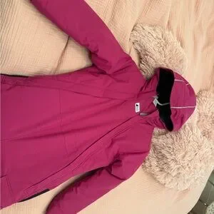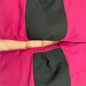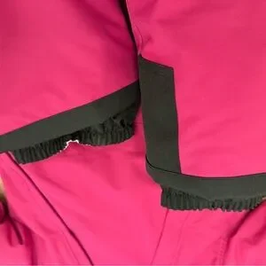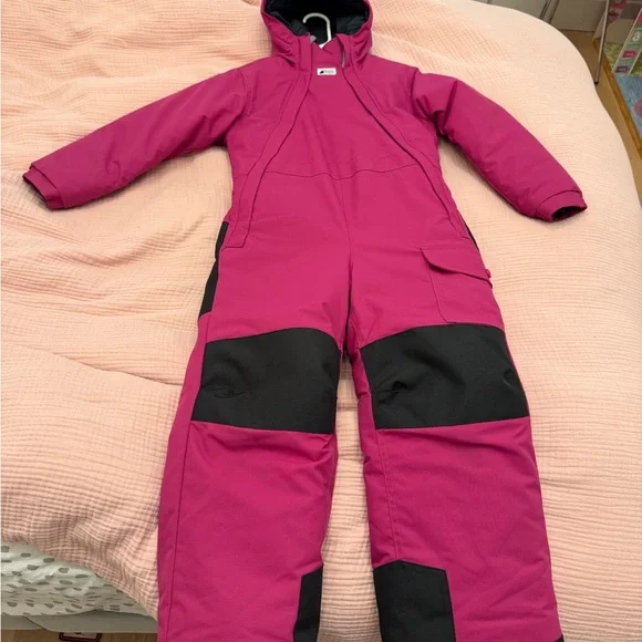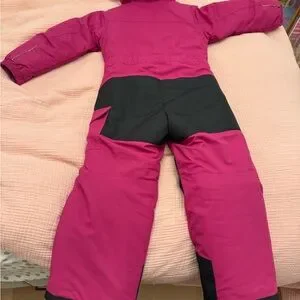 Stylish pink snowsuit with black accents. Perfect for winter activities.