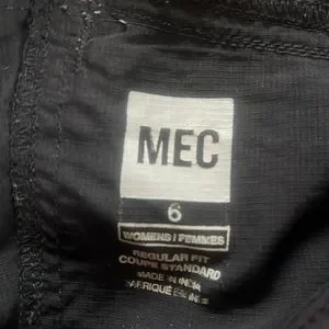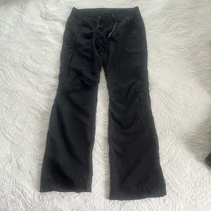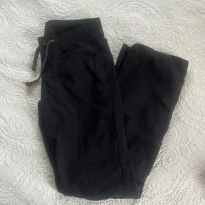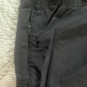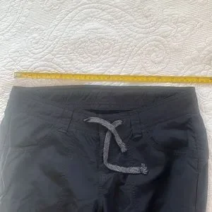 Hiking, outdoors, casual, black pants with roll up option, drawstring waist, back pockets and side pocket with zippers as well as regular front pockets. Great condition! 33” inseam, 15” waistband laying flat
