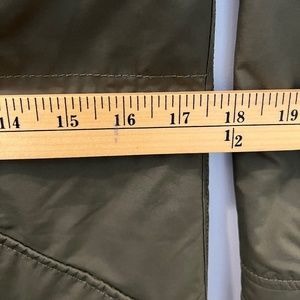 MEC womens green jacket. Good used condition. Removable hood. inside pocket. plaid lining. the size tag has frayed away but I believe it is an XS. Approximately 18" across chest and 17.5" across waist and 30" long. Zip and snaps closed at front. Very versatile jacket. Great for Spring and Autumn.
