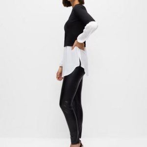 A hint of fluid balloon sleeves adds a bit of grace and perfectly enhances the two tone effect on this layered fooler tunic. Pair our vegan leather leggings with the softly draped hem for a sleek combo.