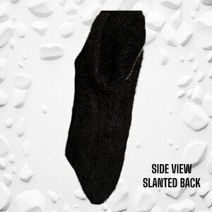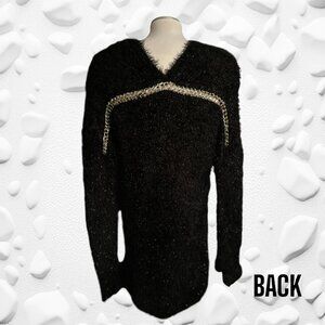 Beautiful V-neck sweater with long sleeves, featuring a unique gold chain insert across the back. The sweater is incredibly soft, in a chic black with gold flecks. The hem is stylishly slanted, shorter in the front and longer in the back. Very comfortable with this soft stretchy fabric.