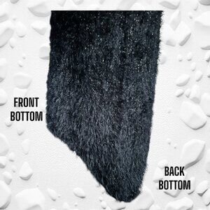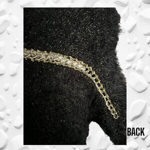 Beautiful V-neck sweater with long sleeves, featuring a unique gold chain insert across the back. The sweater is incredibly soft, in a chic black with gold flecks. The hem is stylishly slanted, shorter in the front and longer in the back. Very comfortable with this soft stretchy fabric.