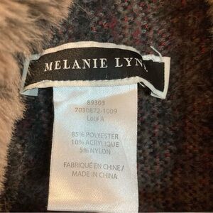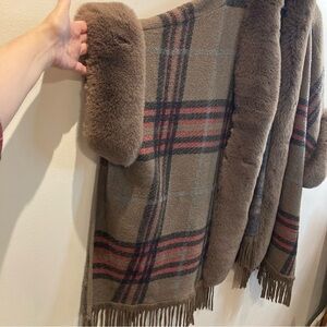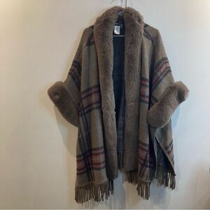 MELANIE LYNE One Size Plaid Super Faux Fur Collar & Sleeve Poncho Wrap W/ Fringe