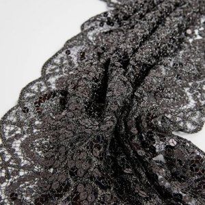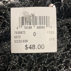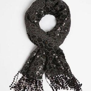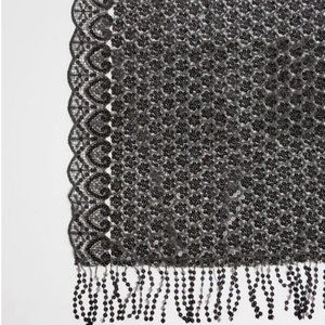 Scalloped edges add charm to this sequin shawl. Elevate your evening attire with this chic design, guaranteed to add warmth and beauty to any look. Scalloped edges Sequin design with fringe Lightweight crochet fabric