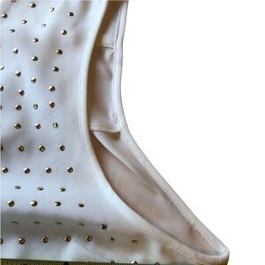 A gorgeous white, backless blouse with gold metallic raised buttons on front and back of shoulders. Longer at the back with a sheer layer of white at bottom. Size 14, see measurements. 20.5 inches from armpit to armpit, 37 inches long, 22 inches midway across front.
