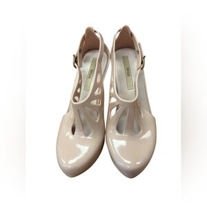 Melissa jelly heels with a wedge platform, heel is ‘5. Ankle strap with gold toned hardware. Close toed, holes along the front of shoe. Blush in color.