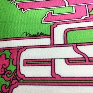 Features: Above knee, fully lined with 100% cotton, gorgeous colourful print, abstract geometrical print, invisible back zipper with additional hook and eye closure, very slight stretch to fabric, monogrammed throughout the print