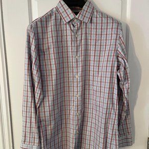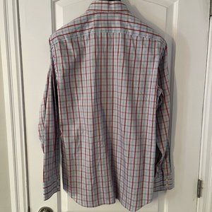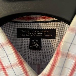 Non-iron slim fit shirt from Banana Republic. Colors in the plaid pattern are red, blue and white. Has been worn, so will shown signs of use but is clean and ready for a new home!