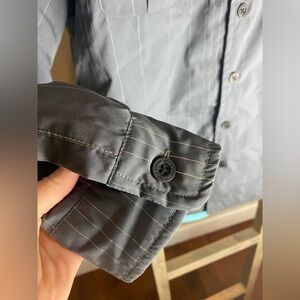 Mens size medium button down spring Lululemon jacket. The jacket is Grey in color with white pinstripe. The jacket is lined and is water resident.