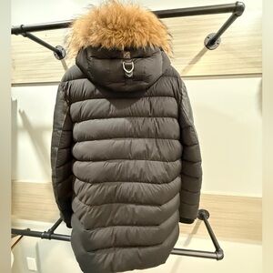 Elevate your winter wardrobe with this sleek black puffer jacket. Features a stylish fur trim for added warmth. Very good used condition.