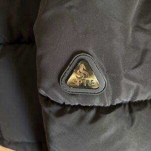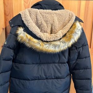 MEN'S SPIRE BY GALAXY BLACK WATERPROOF WARM WINTER COAT SIZE XL. Warm, soft faux fur lined hood that zips off coat, including fur trim that also zips off hood if desired. 2 snaps on hood to secure at neck. White striped trim on front placket and pockets. Front placket has zip and snap closure for warmth. Outer pockets have zip closure; 2 internal pockets, one with zip. Warm polyester quilt lining. NEVER WORN.