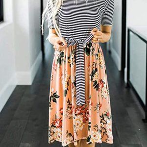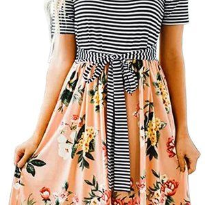 This cute stripe dress is so cute, simple, and comfortable! Features a classic sweet stripe and floral print with short sleeves, and self-tie