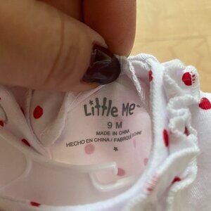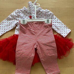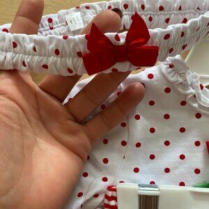 Includes white, red and green pin dot tree tutu dress, white and red pin dot headband and red and white stripe leggings (three pieces total)