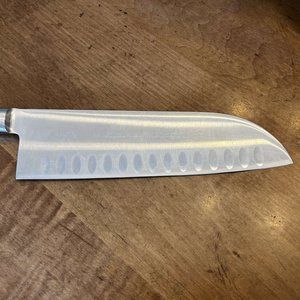 From Messermeister.com: "The Meridian Elite Kullenschliff Santoku Knife is a Japanese chef's knife with the same versatility found in a traditional chef's knife. It has a thin taper for maximum precision when slicing vegetables, fish and meat. The kullens (semi-circular hollows on either side of the blade) reduce drag and ease the cutting and separation of meats, cheese and vegetables. The blade and handle are compatible in width and weight, resulting in a well-balanced knife.