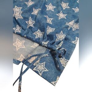 Beautiful M&E shirt with a blue denim like background and white stars,cropped in the front and longer in the back,the sides have side slits with long ties,3/4 length in sleeves.