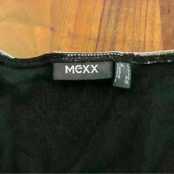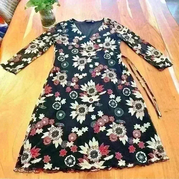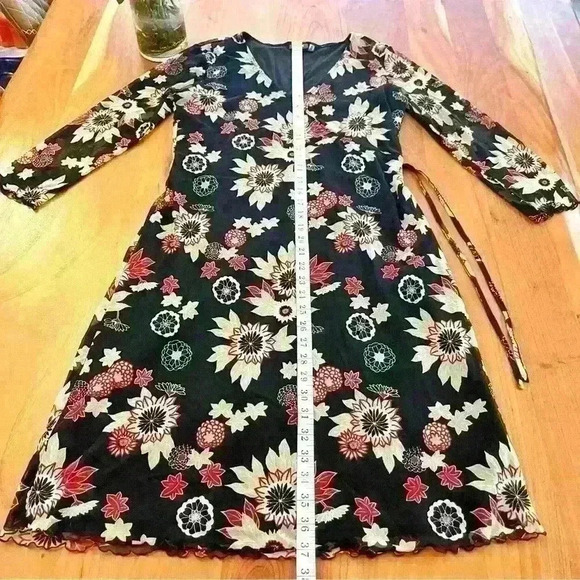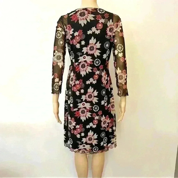 MEXX Floral Romantic Mesh V Neck Black Long Sleeves Midi Dress Size Large.