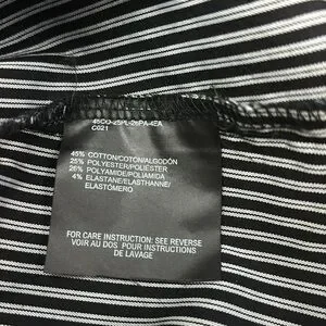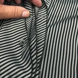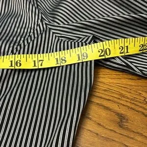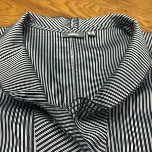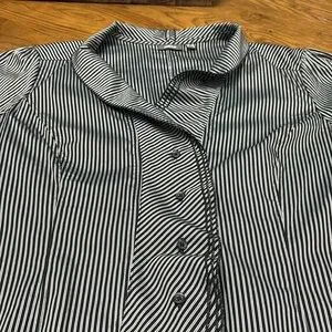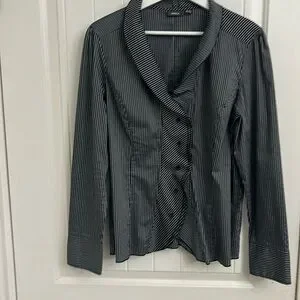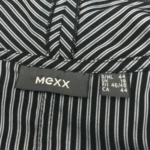 Size UK 18 / US 12-14 MEXX Top with stunning ruffle detail in EUC . This is black and grey pinstriped with collar and V neck leading to front subtle ruffles with a 6 button closure. Beautiful , crisp , classic look . No signs of wear , discolouration. Fabric is 45% cotton, 25% polyester, 26% polyamide and 4% elastane.