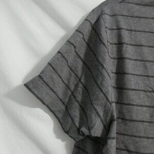 A stylish grey polo shirt with horizontal stripes, short sleeves, and a classic collar