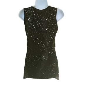 Sleeveless black top with multi-layers of fabric. Layers hang with a slight ruffle. Fabric is covered in different sizes of reflective sparkles. Rounded neckline.