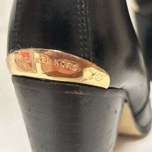 Leather Michael Kors boots with block heel. Heel is 3.25 inches. Very stable and easy to walk in. Lightly worn. A bit of scuffing in the sides and degradation on the small gold parts but none of it is very noticeable. I wear between 7.5-8 women’s.