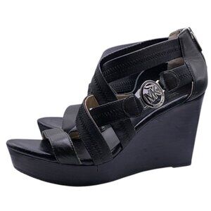 MICHAEL KORS Black Back Zip Strappy Gold Logo Sandal WEDGES