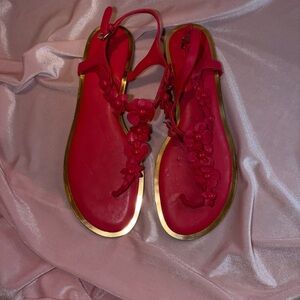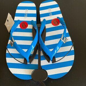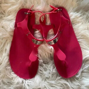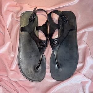 Chic MICHAEL KORS black jelly thong sandals featuring the iconic gold MK logo medallion and sleek flat flip-flop silhouette, perfect for effortless warm-weather styling. Lightweight, flexible, and comfortable with a smooth jelly construction that’s ideal for beach days, poolside lounging, resort wear, vacations, cruises, summer walks, and everyday casual outfits. Timeless black and gold colorway pairs easily with dresses, denim, swimwear, linen sets, and travel looks, making these a versatile designer summer essential. Clean, minimalist design with recognizable branding delivers polished ease without bulk. Excellent pre-owned condition with light, honest signs of wear only, fully cleaned and ready to wear. Highly searched MICHAEL KORS sandal style. Save this item to receive private offers.