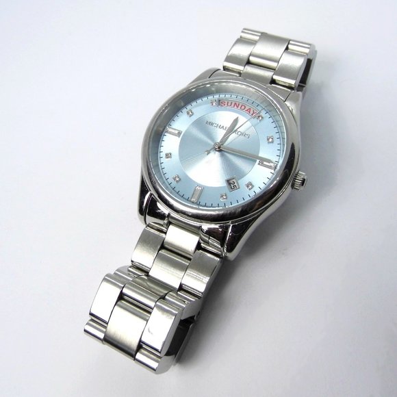 Dial Color: Blue dial with silver-tone hands and crystal hour markers. Day of the week display at the 12 o'clock