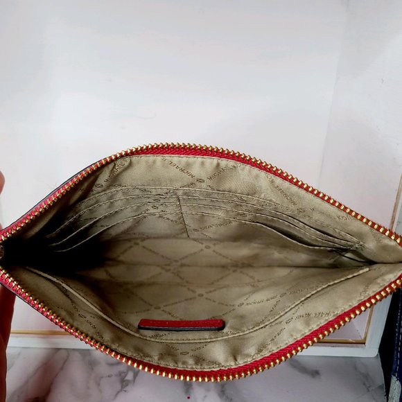 MICHAEL KORS Leather Jet Set Travel XL Zip Grommet Clutch, Rubin Red, GUC