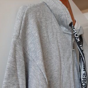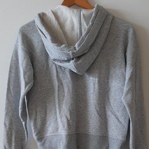Who says you can't mix style and comfort with fashion? This heather grey logo drawstring zip up hoodie is perfect for staying cute even on a gym/errand/coffee run day! Care label has been removed, but likely a cotton blend. Features adjustable hood with its logo, full metal zipper closure, two hand pockets, ribbed cuffs and hem.