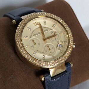 A chronograph watch from Michael Kors with a gold coloured face and navy coloured straps. The face of the watch is ornated with crystals around the edge and in the interior. There are numbers on the face of the watch indicating every five intervals and to indicate the 12th hour. Additionally the date is indicated at the bottom. There are three knobs to adjust the time, start the chronograph, and stop the chornograph.