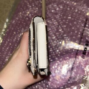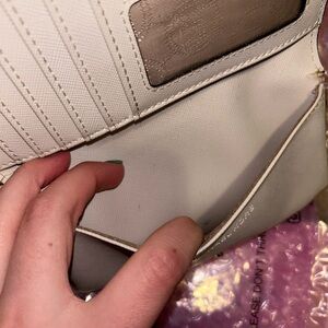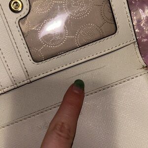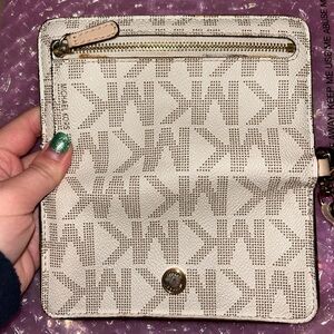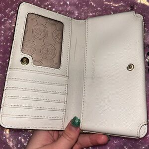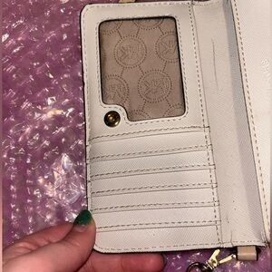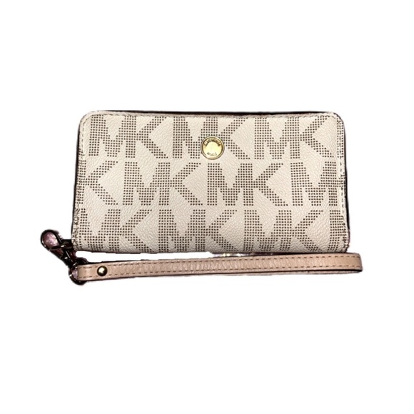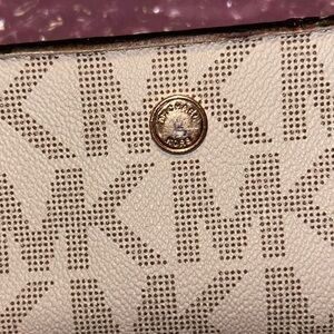 • michael kors wallet, button closure, detachable strap, ID case, 5 card slots, outside zippered pouch, and inside pouch. • has some minor signs of wear, fraying (on the outside rim), minor marks. See photos. Priced accordingly. Lots of use left for this piece still.