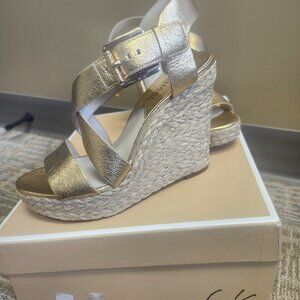 MICHAEL KORS SIZE 6.5 GOLD LEATHER ESPADRILLE WEDGE SANDALS "GIOVANNA"