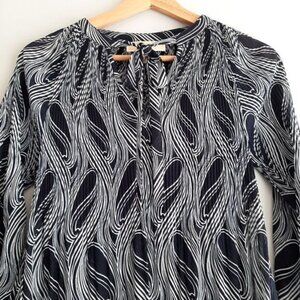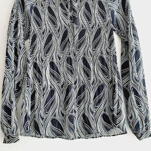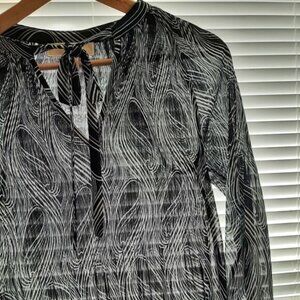 • Long sleeve vee neck with tie, light semi sheer blouse in black and white abstract wavy line pattern.