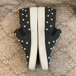 MICHAEL KORS Sz 8.5 Grey Canvass Pearl Studded Rubber Sole Slip On Sneakers Shoes. Beautifully chic while comfortable. A shoe that can take you from all day wear to an evening out. Pretty and elegant.